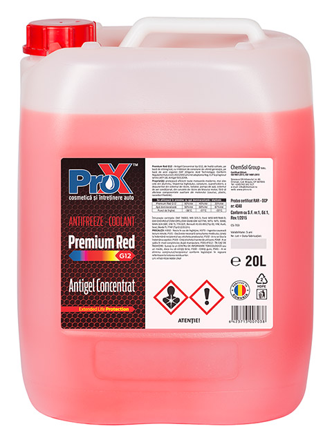Premium Red G12 – Antigel Concentrat tip G12, de înaltă calitate, pe bază de etilenglicol, cu inhibitori de coroziune de ultimă generaţie, pe bază de acizi organici OAT (Organic Acid Technology). Conform Regulamentului (UE) 2022/692 privind adaptarea Reg. CLP la progresul tehnic (ATP 18). Antigel fără 2EHA.